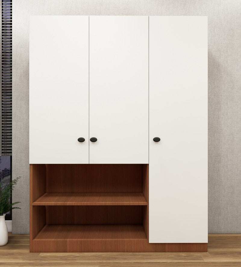 Burma Teak & Wool White Finish 3 Door Wardrobe – Elegant Storage with Open Shelves