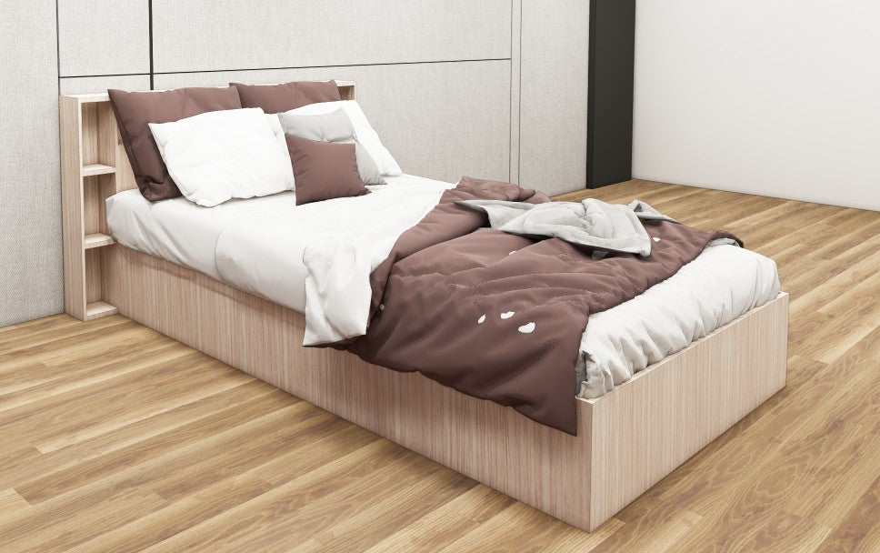 Modern Oak Finish Single Bed with Headboard Storage